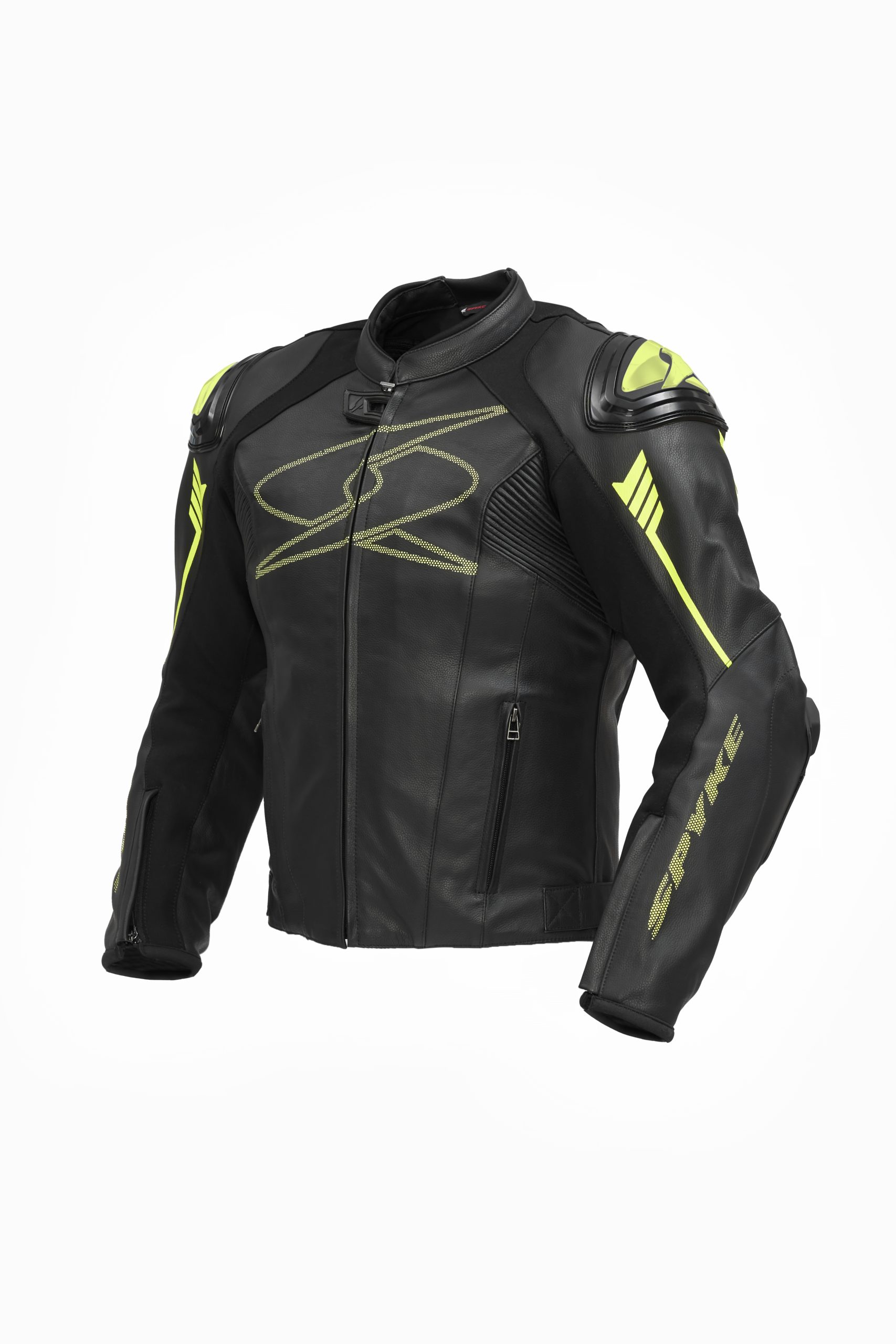 Shoulder and elbow protectors CE-approved according PN EN 1621-1:2012. Back pocket for CE back protector level 2. Outer, interchangable elbow slider. External SPYKE logo shoulder protectors. Stitching: safety seams construction according to EN 17092:2020 standard. Premium cow hide outer shell construction. X-STRETCH panels on sides and inner sleeves. Racing back hump for improved aerodynamic performance. Racing- shaped sleeves. Accordion inserts on elbow and back. Auto lock zippers on sleeves. 2 outer pockets. Perforated leather panels for air ventilation. Waist adjustment with strap and velcro. Thermal removable quilt liner with mobile and document pocket. 1 inner pocket. Connecting zipper.